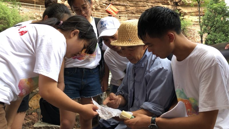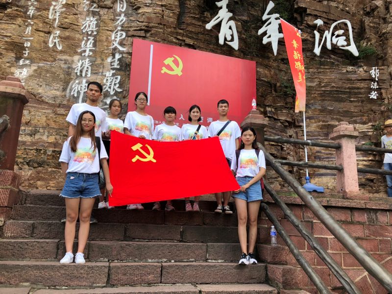 7月15日上午,考察团奔赴此次活动第二站—青年洞。首先,队员们针对红旗渠精神向一些游客进行了随机调查,同学们从每位游客饱含深情的解答中感受到了满满的民族自豪感以及对红旗渠精神“自力更生,艰苦奋斗”强烈的认同感。随后,在纪念红旗渠总设计师、林州老书记杨贵同志处,亲耳聆听了两位曾参与过红旗渠开凿过程的老爷爷热情的向我们讲述开凿红旗渠时的艰辛危险,并将自己为纪念杨贵同志去世而写的诗一字一句读给我们听。他们对红旗渠真挚的感情让我们感受到了红旗渠精神散发的光辉。观察团成员在青年洞前面对党旗重温了入党誓词。