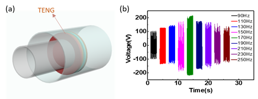 研究人员将摩擦纳米发电机(TENG)与聚合物管集成起来,用于从环境中获取声能,其工作频率稳定在20 Hz-1000 Hz之间。TENG是由电纺聚偏氟乙烯(PVDF)纳米纤维和导电织物组成,独特的结构设计,有利于声能的捕捉和电输出的增强。在170 Hz和115 dB的声波下,TENG开路电压和短路电流分别可以达到400 V和175 µA,瞬时最大输出功率密度为7 W/m2。另外,该系统不仅可用于音频分析和噪声检测,还可作为一种自驱动的麦克风。该成果设计的TENG不仅可以分辨出音叉的频率,还可以记录人说话的声音,并分辨出人的语音信号的频率范围。此外该成果还演示了用TENG记录中国传统名曲《茉莉花》,并通过电脑将记录的音乐播放出来。该成果不仅为制造高性能声音驱动的摩擦纳米发电机提供了一种简单、经济有效的方法,而且使自供电传感应用成为可能,在人工智能、物联网、环境降噪等方面具有潜在的应用前景。