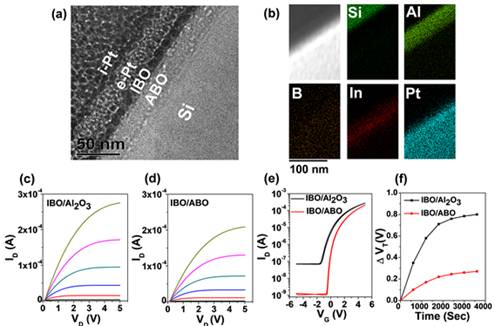 金属氧化物薄膜晶体管(MOTFT)是下一代平板显示器件中的核心部件,然而MOTFT在长时间栅极偏压作用后,容易出现迁移率下降、阈值电压漂移和亚阈值摆幅增高等现象。造成MOTFT电学不稳定的重要原因是氧化物有源层与绝缘层界面处的氧空位缺陷,氧空位俘获导电沟道中的载流子,从而影响了器件的电学性能。本项工作在理论计算模拟的基础上,首次对金属氧化物有源层和绝缘层进行协同硼离子掺杂,通过优化器件结构和掺杂比例,所得MOTFT器件的迁移率达到11.3 cm2V-1s-1,亚阈值摆幅为0.17 Vdec-1,电流开关比大于105,其正向偏压后的阈值电压漂移为0.25 V,比未掺杂器件降低3-4倍。该工作“Synergistic Boron Doping of Semiconductor and Dielectric Layers for High-Performance Metal Oxide Transistors: Interplay of Experiment and theory”在国际顶级刊物Journal of the American Chemical Society (2018, 140: 2501)上发表。