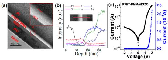 氧化物/有机物杂化二极管在高频整流电路中有广阔的应用前景,本项工作采用化学溶液法制备了P3HT-PMMA/IGZO异质结二极管,系统研究了由于相分离在薄膜界面处产生的PMMA对器件电学性质的影响。研究发现不同P3HT-PMMA比例可以调控IGZO氧化物薄膜的表面功函数,使二极管的正向输出电流增大近十倍,并保持良好的整流特性。相关研究工作“Oxide-Polymer Heterojunction Diodes with a Nanoscopic Phase Separated Insulating Layer”在国际顶级期刊Nano Letters (2019, 19(1): 471–476)上发表。