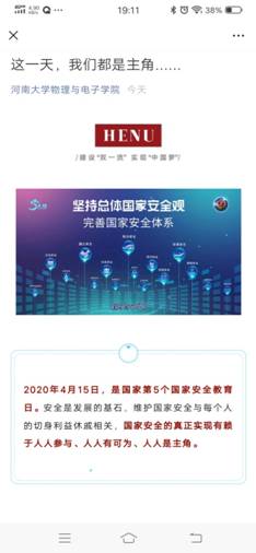 在学院网站、电子显示屏、微信公众号上推送“国家安全教育”相关知识;在教师微信群宣传河南省教育厅微信公众号上推出的典型案件;在员工QQ群上传《坚持总体国家安全观 提高国家安全意识》PPT,PPT从危害国家安全的案例开始,分析了新形势下国家安全面临的压力和风险,要求员工提高认识,树立国家安全的主人翁意识。