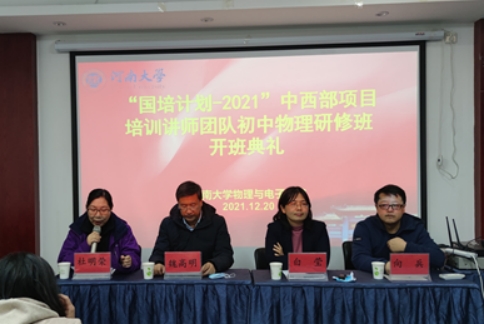 12月20日上午,“国培计划-2021”中西部项目培训讲师团队初中物理研修班开班典礼在尚客优快捷酒店(新河大店)3楼会议室举行。必赢242net经理白莹、副经理魏高明、大学物理教研室主任杜明荣、继续教育办公室主任向兵等有关负责人和来自全省各个县区的近50名初中物理精英教师参加了开班典礼。典礼由魏高明主持。