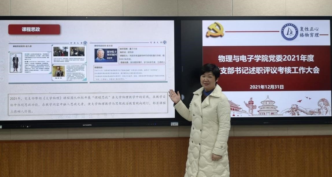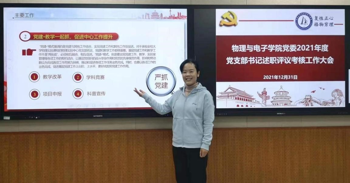 会上,各党支部书记分别从贯彻落实上级党组织工作部署、支部自身建设、“三会一课”制度落实、组织生活会和党支部特色工作、党建工作存在问题及下一步工作思考等方面进行了述职。各党支部围绕“党建+”,将党建工作与支部的特点工作相结合,亮点纷呈。其中,物理系教工第一党支部以“党建+科研”着力点,通过格物青年论坛的方式促进支部党员进行科研交流;大学物理教工党支部以“党建+课程思政”为出发点,创新课程形式,加强“课程思政”在《大学物理》教学中的实践,使大学物理与思想政治教育同行,彰显课程立德树人价值;电工电子实验中心教工党支部以“党建+宣传”为突破口,结合电工电子实验中心的教学优势,开辟新的宣传窗口,从“小物件”中引出“大思想”,推动党史教育深入员工;物理实验中心党支部书记以“党建+教学、党建+竞赛、党建+项目、党建+科普”为抓手,在教学中融入思政元素,在教学目标中体现思政功能,影响和带动广大教师努力拼搏,开创党建新局面。