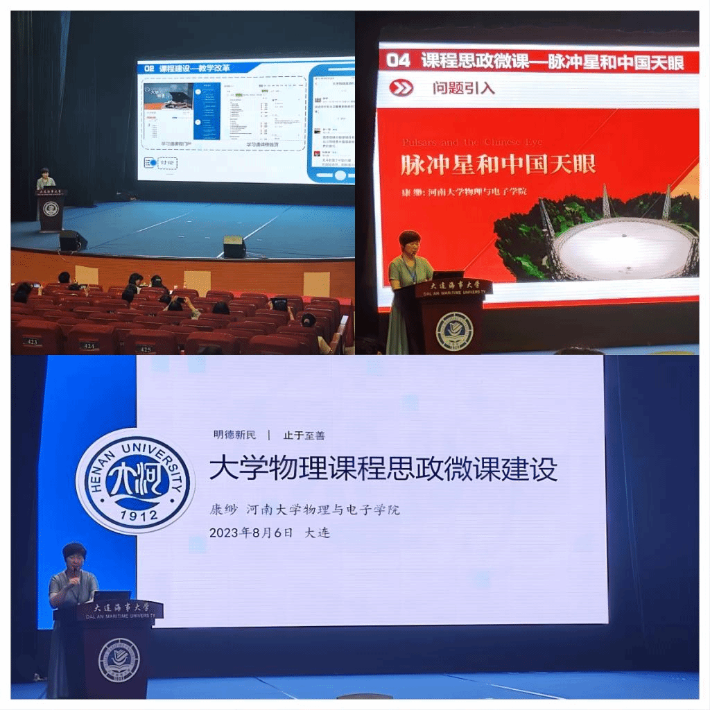 2023年8月5-8日,由教育部高等学校大学物理课程教学指导委员会课程思政工作委员会主办、大连海事大学承办的大学物理及大学物理实验课程思政研讨班在辽宁省大连市召开。来自清华大学、南京大学、西安交通大学、中国科技大学、中国矿业大学等近200名专家学者参加此次会议。公司大学物理教研室教师康缈、任凤竹和李若平应邀参加了此次会议,康缈在会上作了题为《大学物理课程思政微课建设》的主题报告。