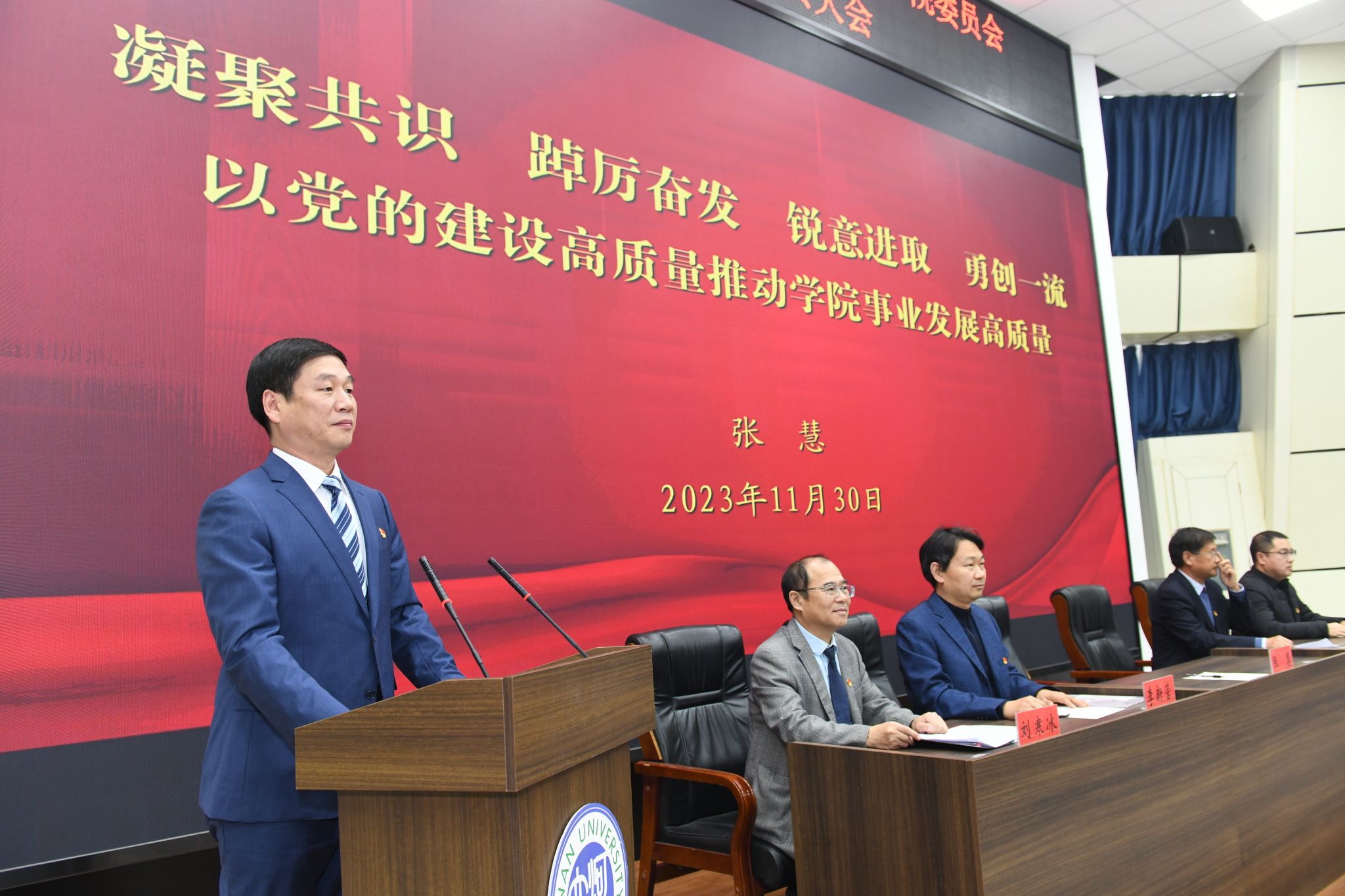 大会在庄严肃穆的国歌声中拉开序幕。公司党委书记张慧代表上一届委员会向大会作《凝聚共识,踔厉奋发,锐意进取,勇创一流,以党的建设高质量推动学院事业发展高质量》的工作报告。报告指出,五年来,公司党委坚持以习近平新时代中国特色社会主义思想为指导,团结带领全院师生员工,认真学习贯彻党的十九大、二十大精神,聚焦立德树人根本任务,着力内涵发展,彰显学科特色,在党的建设、人才培养质量、团队队伍、学科与科研、民生及社会服务等方面都取得了可喜成绩和宝贵经验。五年来,聚焦立德树人,人才培养质量持续提升;引进培育结合,锻造高水平团队队伍;瞄准科技前沿,科研创新能力显著增强;立足优势特色,团队建设提质增效;强化社会服务,拓宽育人辐射效应;汇聚员工资源,凝心聚力共谋发展;聚焦民生工程,教职工生幸福指数不断提升;办好学科百年庆典,开启学院发展新篇章;坚持党建引领,党的建设全面加强;强化制度建设,基层治理能力明显提升。与此同时,学院发展还存在问题和不足。