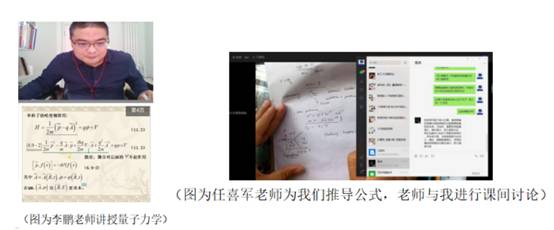 疫情严重时,老师每节课的第一句话就是叮嘱我们注意身体健康,严防疫情。面对屏幕,老师们无法做到像在教室一样面对同学们讲课,但是每个老师都尽自己最大的能力将每一堂课的知识完完整整地传授给我们。无论是课上还是课下,老师们都在尽心尽力的帮助我们学习。教授我高等量子力学的李鹏老师将深奥的量子力学潜入深出,让我们透过一个个公式看见了大自然的神奇。任喜军老师。线上教学依然用朴素的纸与笔写出物理学的精粹,推导公式化繁为简带我们感受物理学的巧妙。一个个巧妙的隐喻在老师们口中都变成一把把钥匙带我们走进物理的殿堂。